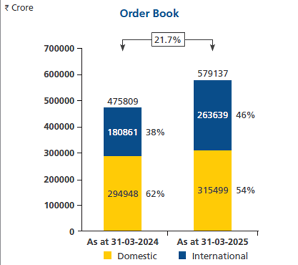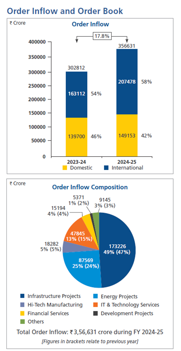 Order Inflow - In the below snapshot, it can be seen there is an increase of 17.8% increase in order inflow which is about 54,000 crores which is huge. In billion-dollar terms, it will be around 6.5 billion US dollars. Total order inflow is 3.5 lac crore for year 2024-25 which is also very huge. As can also be seen, the international order inflow is higher than the Domestic (India) order book.