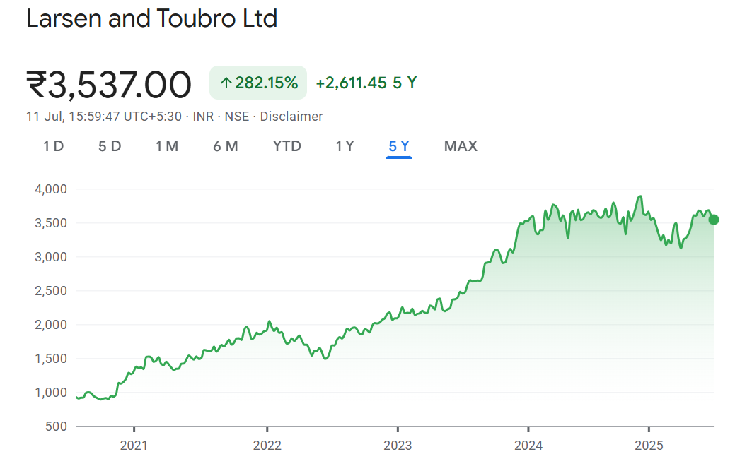 L&T currently trades at a P/E of ~32x, reflecting investor confidence in its strong order pipeline and diversified operations.